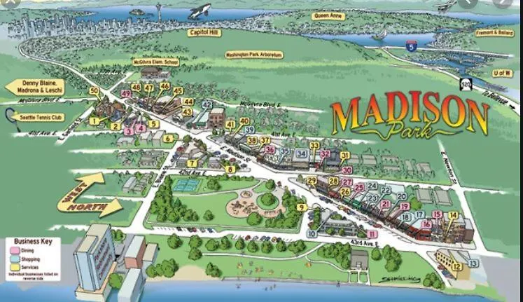 Smith Tower ist 3.6 km entfernt. Das Stadtzentrum von Seattle ist in einer Entfernung von 4 km. In der Umgebung gibt es mehrere Restaurants, darunter Vios Cafe & Market Place, Cafe Flora und Tallulah's.Die Villa ist nahe Madrona Park gelegen.
